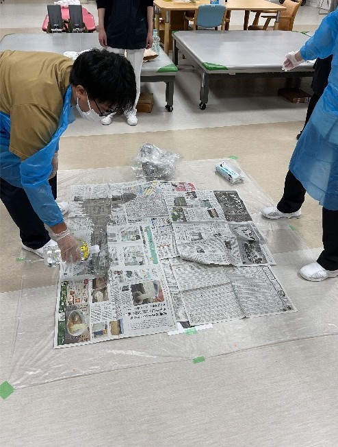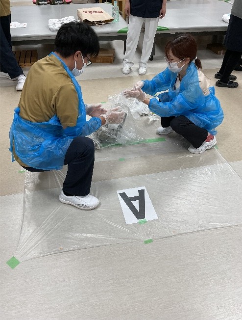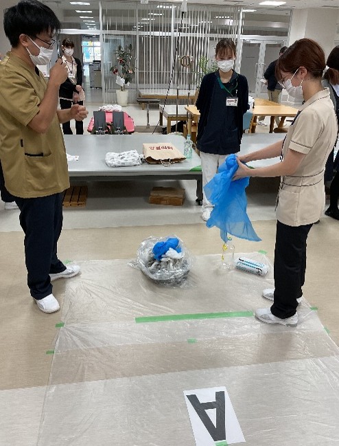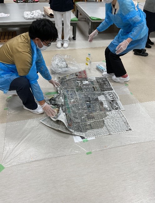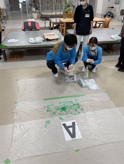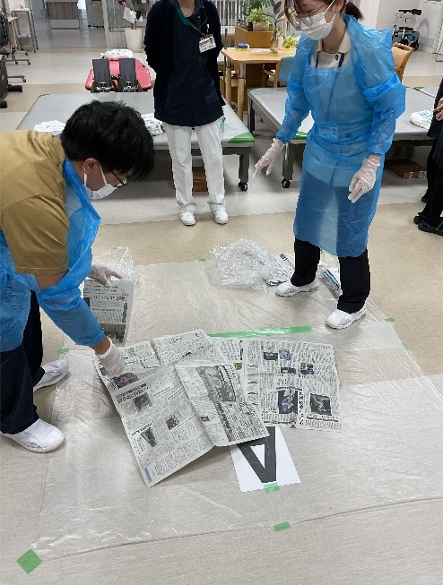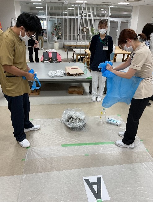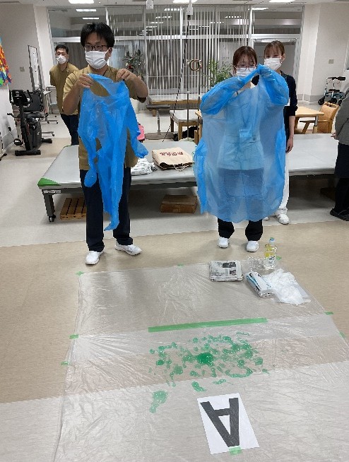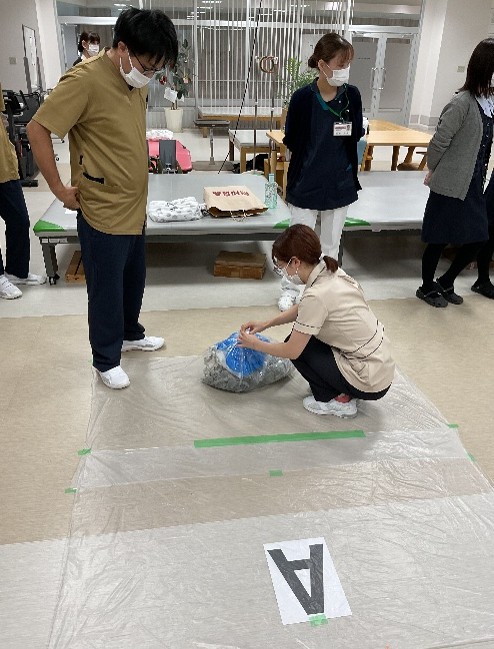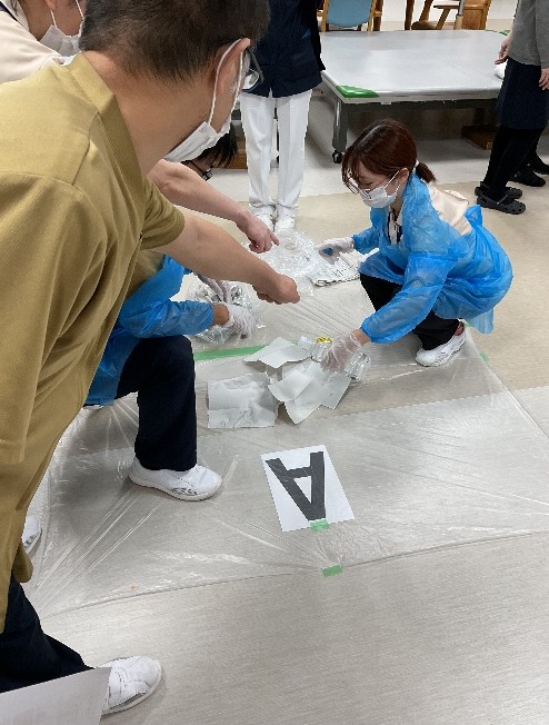 11月12・14日に感染対策研修(ノロウィルス等の感染が疑われる吐物処理方法)を行いました。看護部代表職員が吐物処理を実践、見学で見守る職員は手順を確認しながら助言を行い、改めて正しい方法を確認し合って有意義な研修となりました。感染委員会主導、看護部指導のもと有事の際、部門職種を問わず全職員が実践できることが当院の目標です。