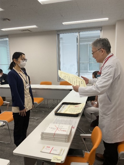 1月23日(金)、長岡福祉協会新年会で永年勤続表彰が行われました。当院職員は1月26日(月)、病院において表彰式を行いました。今年は20年表彰対象が6名、10年表彰対象が3名でした。長きに渡り法人に尽力し、今後も大いに期待される職員を表彰できたことは病院の誇りです。病院として、これからも患者様により良い質の高い医療・看護サービスを提供するため職員との信頼関係を築き、互いを高められる環境づくりに尽力いたします。